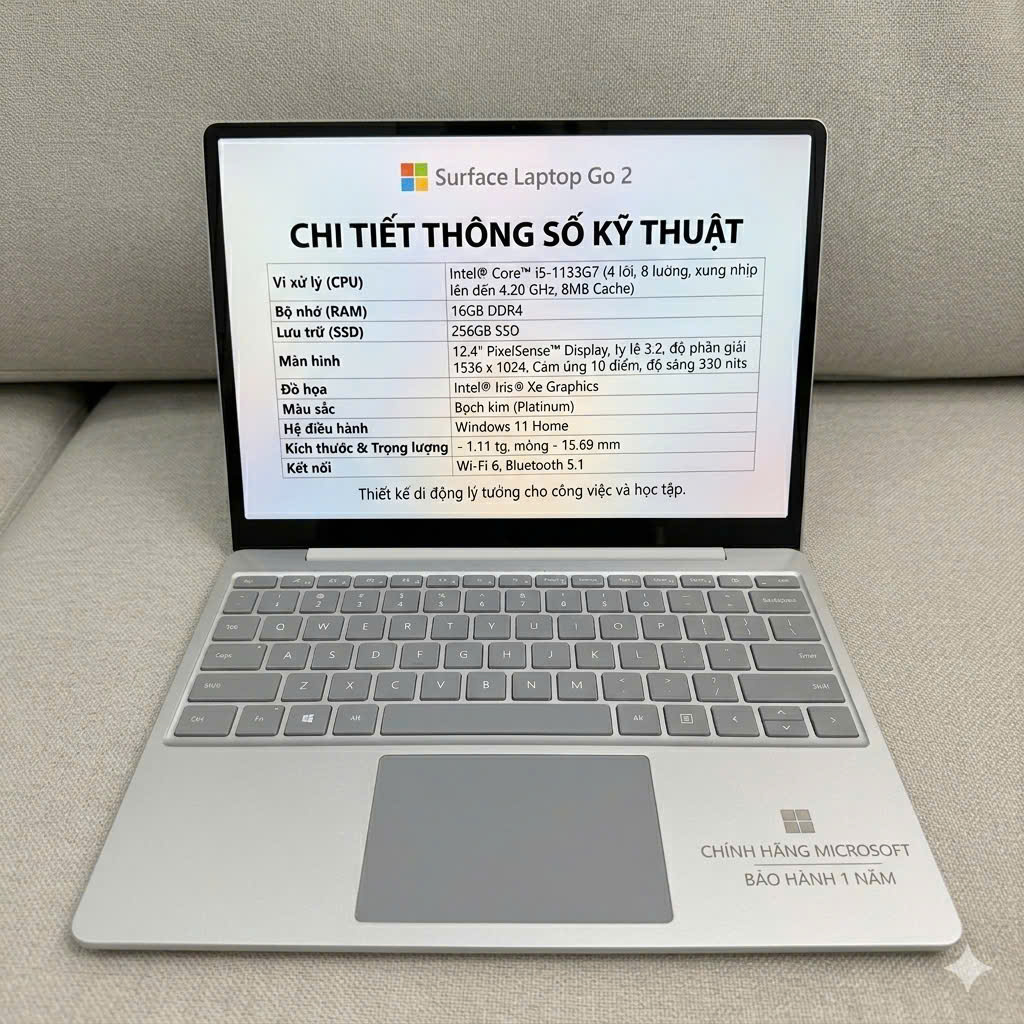 Surface Laptop Go 2 – Nhỏ gọn, mạnh mẽ, hoàn hảo cho công việc di động Surface Laptop Go 2 là chiếc laptop siêu gọn nhẹ của Microsoft, được thiết kế dành cho người dùng cần một thiết bị linh hoạt để học tập, làm việc và di chuyển hàng ngày. Máy sở hữu ngoại hình tối giản đặc trưng của dòng Surface với khung nhôm cao cấp, trọng lượng chỉ khoảng 1.12kg, dễ dàng mang theo mọi nơi. Phiên bản trang bị Intel Core i5-1135G7, RAM 16GB và SSD 256GB mang lại hiệu năng ổn định cho các tác vụ văn phòng, học tập, chỉnh sửa hình ảnh cơ bản hay làm việc đa nhiệm mượt mà. Ổ SSD giúp máy khởi động nhanh, mở ứng dụng gần như tức thì và đảm bảo khả năng lưu trữ dữ liệu an toàn. Màn hình 12.4 inch PixelSense cảm ứng, tỷ lệ 3:2 đặc trưng của Surface cho không gian làm việc rộng rãi, hiển thị sắc nét và rất phù hợp cho việc đọc tài liệu, lướt web hoặc soạn thảo. Bàn phím full-size êm ái, trackpad lớn, cùng thời lượng pin tốt giúp bạn làm việc liên tục suốt cả ngày. Surface Laptop Go 2 là lựa chọn lý tưởng cho sinh viên, nhân viên văn phòng hoặc những ai cần một chiếc laptop đẹp – gọn – bền – hiệu năng ổn định trong tầm giá hợp lý.